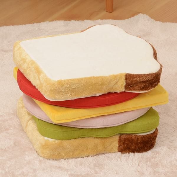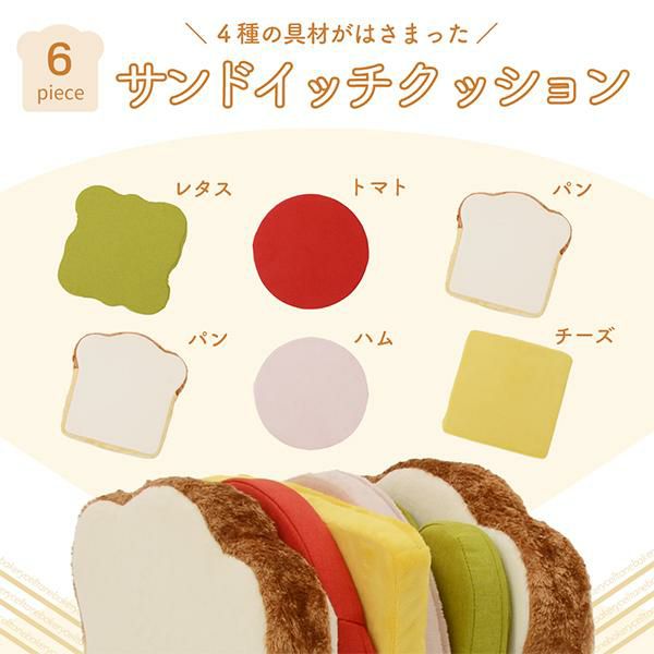 2枚の食パンクッションの間にはハム、チーズ、レタス、トマトといった定番の具材がサンドされているかわいいデザイン!