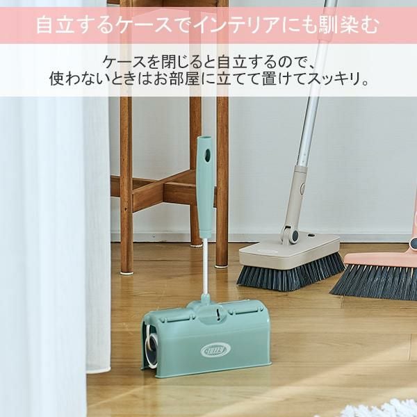 粘着部が収納できるケース一体式の粘着ローラー。ケースはパッと跳ねあげられて、スムーズに掃除ができます。ケースを閉じると自立するので、使わないときはお部屋に立てて置けてスッキリ。別売のジョイント伸縮ポールを取り付ければフロア用として、ポールを取りはずせばハンディタイプとして使用できます 。