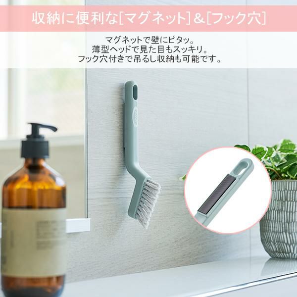 細かい部分の掃除にピッタリな、隙間ブラシ。バスルームの壁に貼り付けておくことで、気になる部分をいつでもサッとお掃除することができます。フック穴を使って、吊るしての保管も可能です。