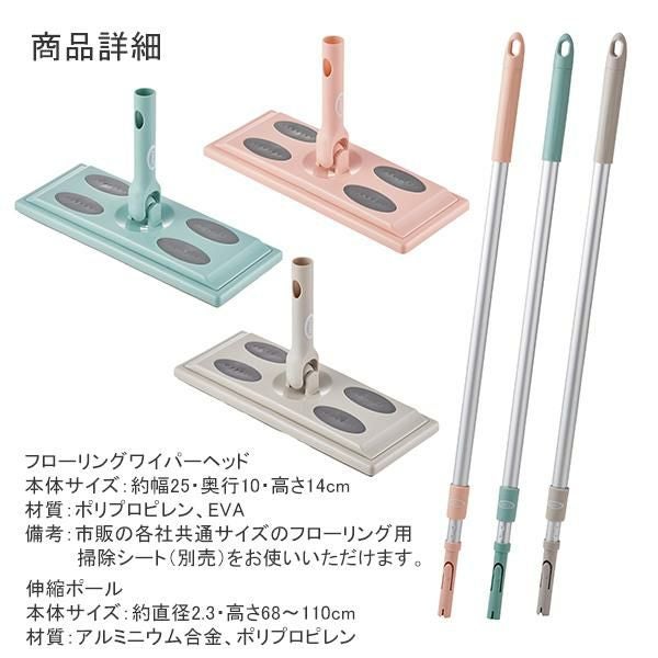 フローリングワイパーは軽量でスムーズな回転が使いやすく、シートの交換も差し込むだけのラクラク構造。底面はソフトな発泡クッションで、床を傷つけずに、効率的にゴミを回収します。※市販の各社共通サイズのフローリング用掃除シート(別売)をお使いいただけます。またジョイントポールは他3種類のヘッドが付け替えられるので、家中の様々な場所を掃除できます(他ヘッド別売り)。