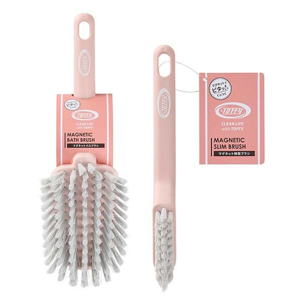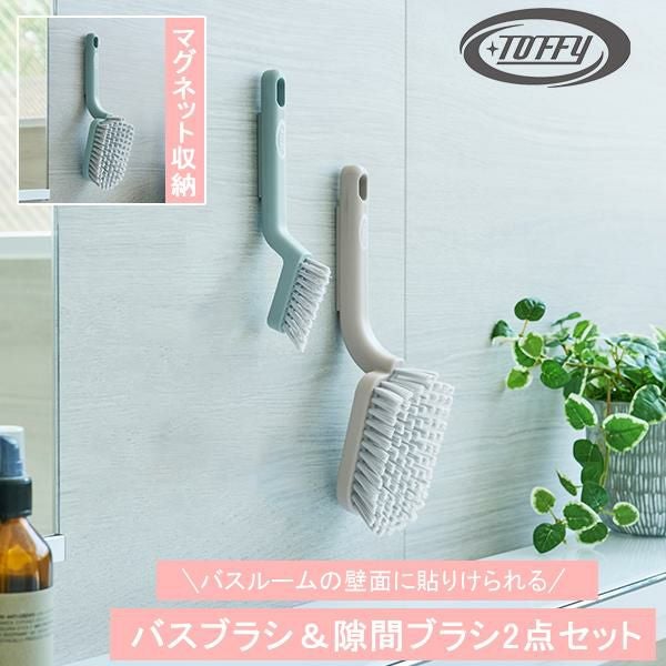 やや硬めブラシでタイルも樹脂床もしっかり磨け、汚れをゴシゴシ気持ちよく落とせるバスブラシと、細かい部分の掃除にピッタリな隙間ブラシのセット。マグネットで壁に付けて収納でき、いつも清潔を保てます。