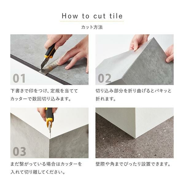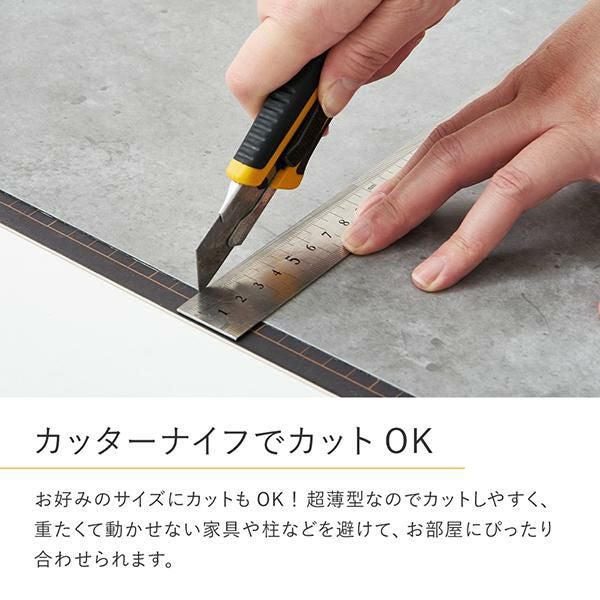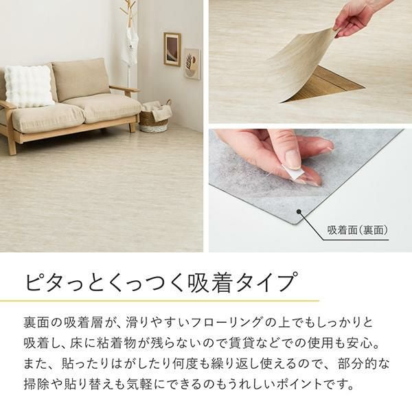 貼ってはがせて、何度も繰り返し使えるフロアタイル。フィルムをはがして、床の上から貼るだけでお部屋を簡単にイメージチェンジできます。超薄型&軽量なので施工も簡単!賃貸や新築の床への汚れや傷の防止にも。キッチンや洗面所など水周りにも使えて、粘着が落ちても水で洗えば繰り返しご使用いただけます。カッターで簡単にカットできるので、お部屋に合わせて自由に敷き詰められます。