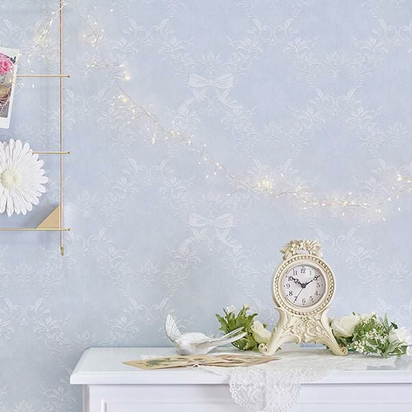 少しだけくすんだ淡く優しいブルーカラーで、繊細なオーナメントに柔らかな印象のリボンを組み合わせた柄を作りました。