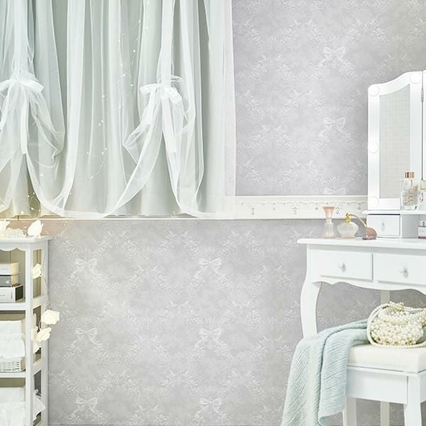 上品で淡いグレーカラーで繊細なオーナメントに柔らかな印象のリボンを組み合わせた柄を作りました。