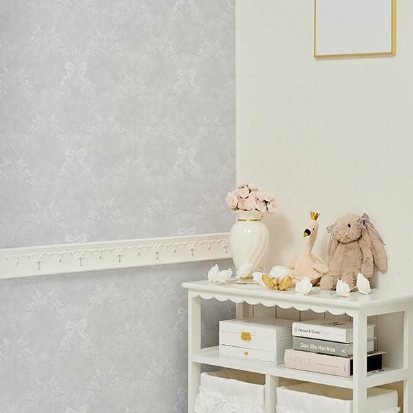 上品で淡いグレーカラーで繊細なオーナメントに柔らかな印象のリボンを組み合わせた柄を作りました。