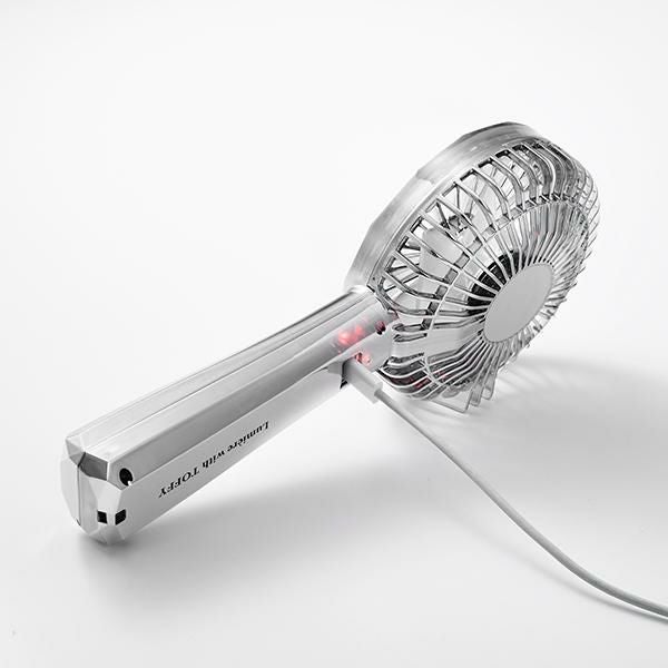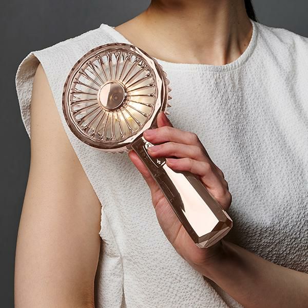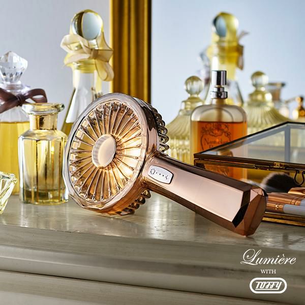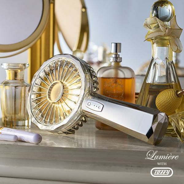 レトロなデザインが特長のToffy シリーズにあって、ひときわ異彩を放つ、個性的で美しいハンディファンです。これまでにない、抑揚のある曲線とクリスタルカットのコンビネーションは、ハーフミラーを通した光(リュミエール)の効果をいっそう引き立たせます。