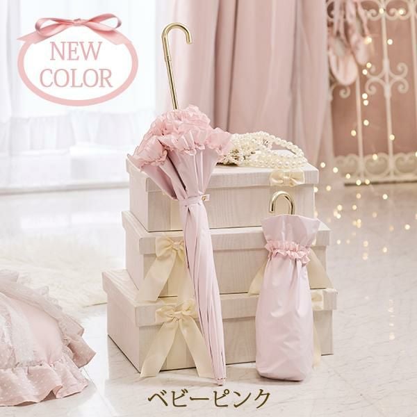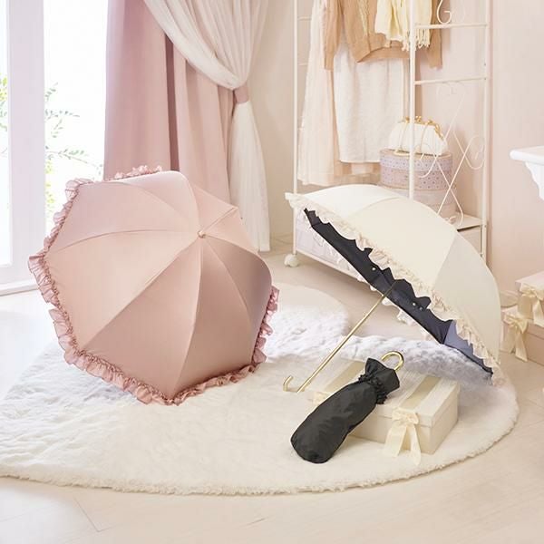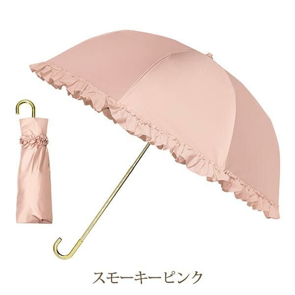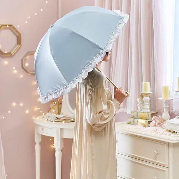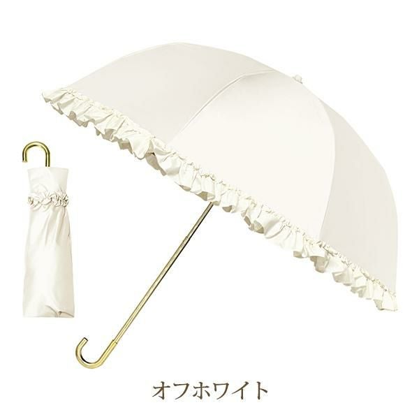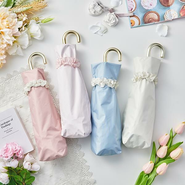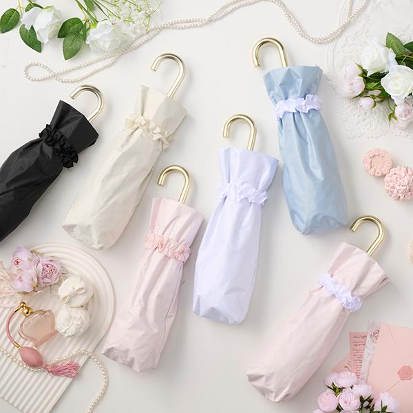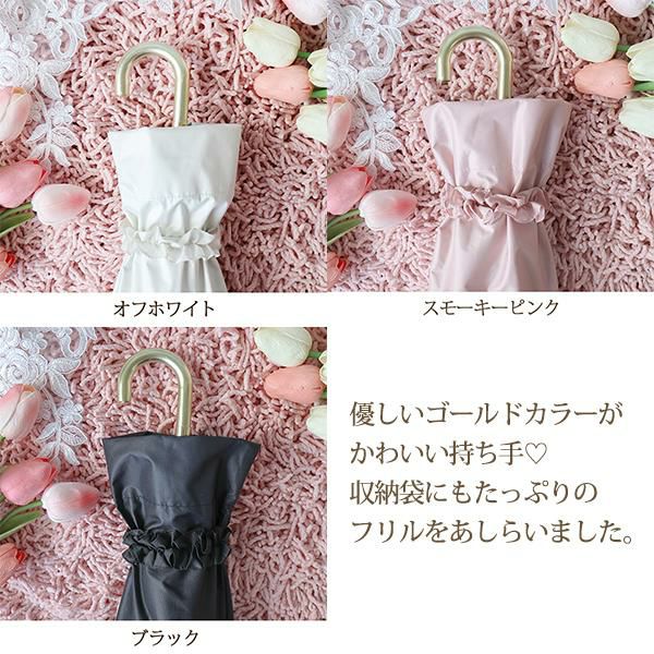 たっぷりフリルとゴールドの持ち手がかわいい、完全遮光の折りたたみ傘。