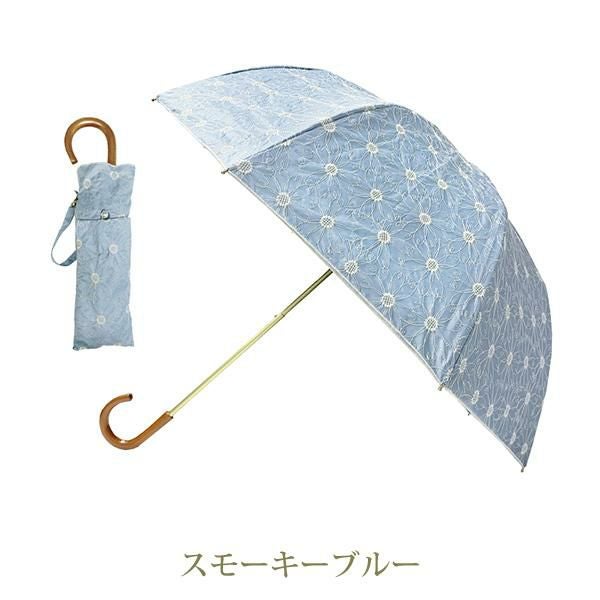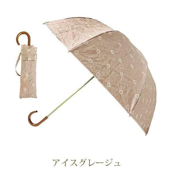 全体に施されたデイジーの刺繍と持ち手が上品な、完全遮光の折りたたみ傘。