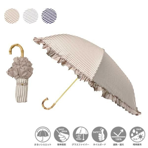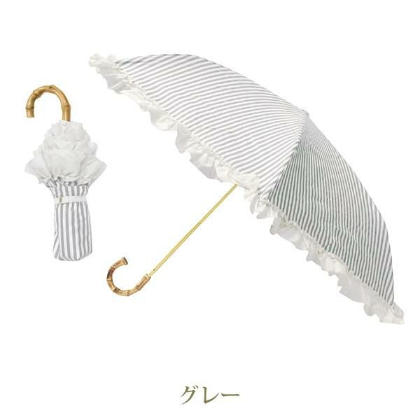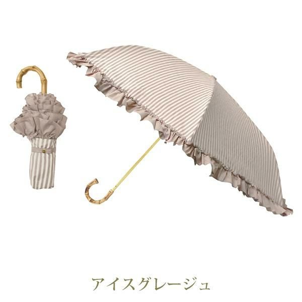 ストライプにたっぷりフリルがガーリーな、完全遮光の折りたたみ傘。