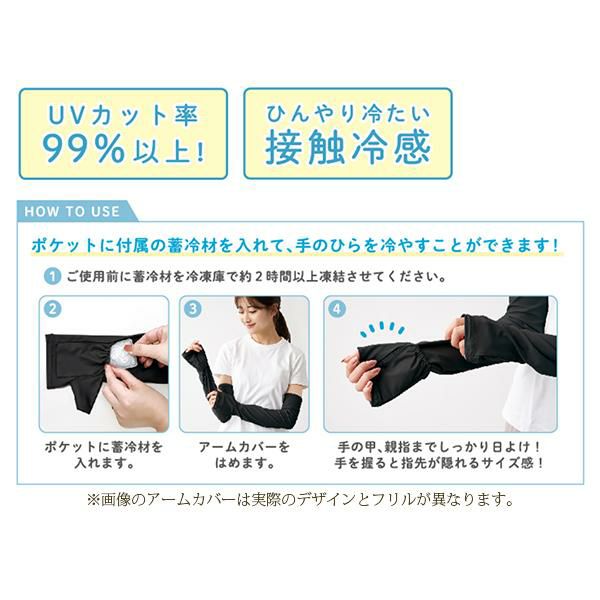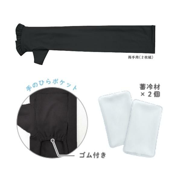 手のひらを冷やすアームカバー。蓄冷材がセットになっているのでポケットにセットすれば、手のひらを冷やすことができます。ポケットはゴム付きですっぽり収まります。