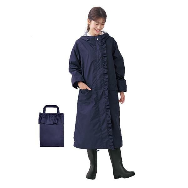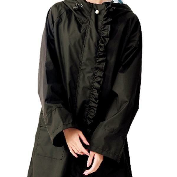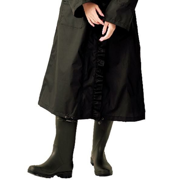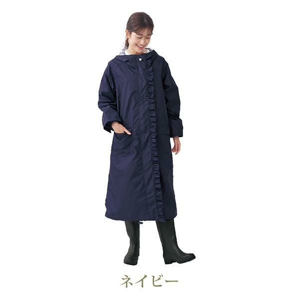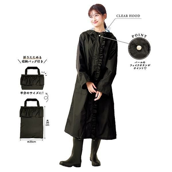 パールのフェイクボタンと前立てのフリルがポイントのレインウエア。ひざ下のロング丈で足元を雨からカバーします。