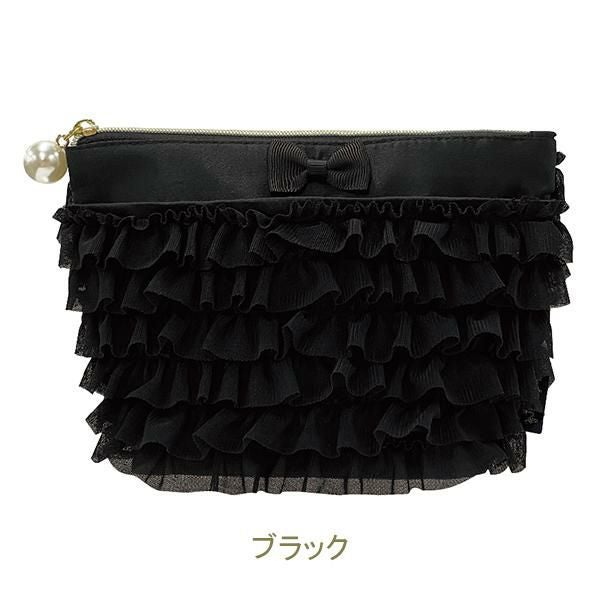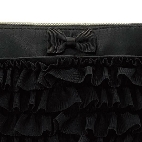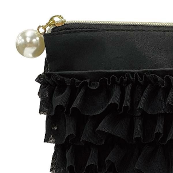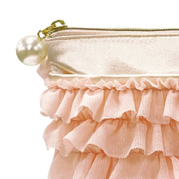チュール生地をたっぷりあしらった、フリフリの底マチがあるポーチ。幾重にも重なったミニフリルがロマンティック♪上部中央にはグログランテープの小さなリボン付き。ファスナーの引手にはパールモチーフを付け、かわいいにこだわったデザインです。