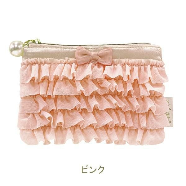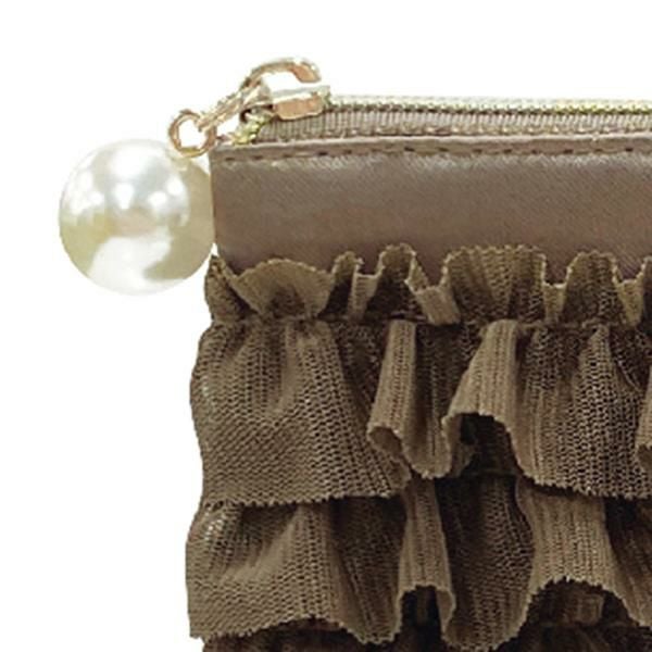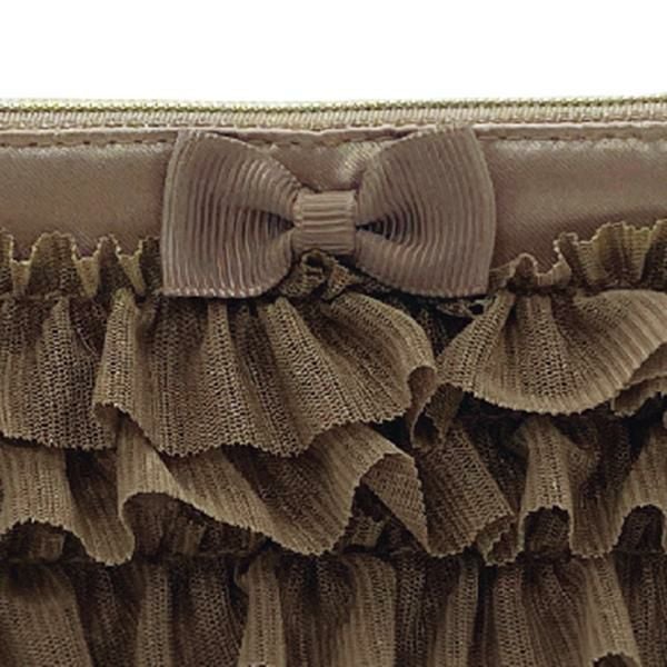 チュール生地をたっぷりあしらった、フリフリのティッシュポーチ。幾重にも重なったミニフリルがロマンティック♪上部中央にはグログランテープの小さなリボン付き。ファスナーの引手にはパールモチーフを付け、ティッシュポケット面にもフリルたっぷりで、かわいいにこだわったデザインです。