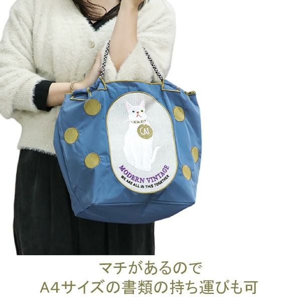 マチが広く、A4サイズもすっぽり、手提げでも肩掛けにもなる2WAYタイプのバッグ。エコバッグ、ショッピングバッグをたくさん持っていてもせっかくだからおしゃれに個性的なバッグが持ちたい方へおすすめです。ボリュームのある刺繍が特徴で、内側には便利なポケット付き。また折りたたんで丸めて付属のゴムでまとめてコンパクトに収納できます。ちょっとしたお買い物やお出かけにちょうどいいサイズのバッグです。