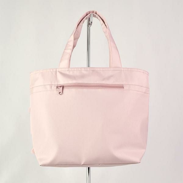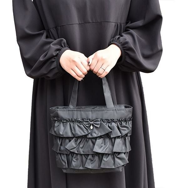 上品な3段フリルがとっても華やかで、コーディネートのアクセントに。内ポケット3つ、ファスナー付き外ポケットも付いているのでしっかり整理整頓ができそう。軽量で折りたたみ可能、はっ水加工の生地なので雨の日や旅行時にも便利なアイテムです。