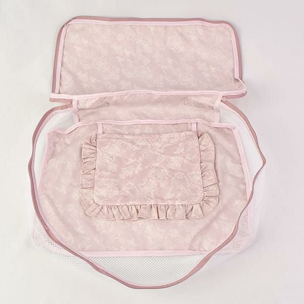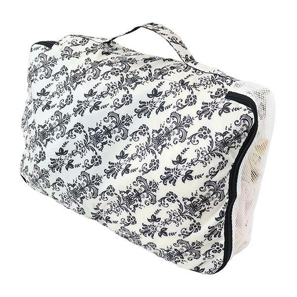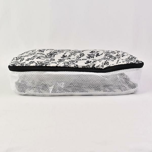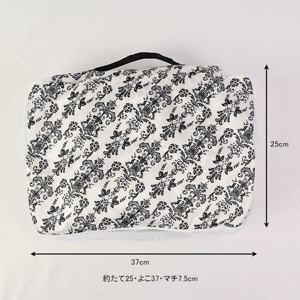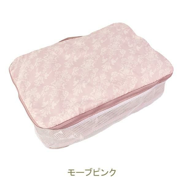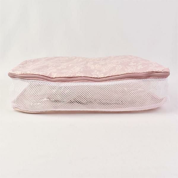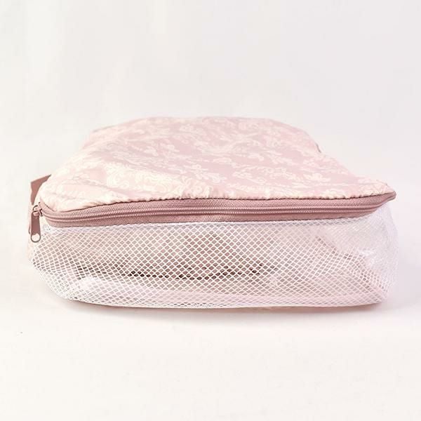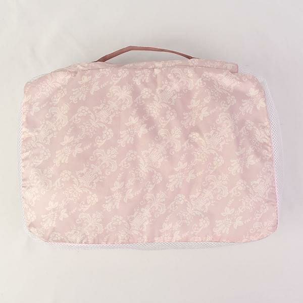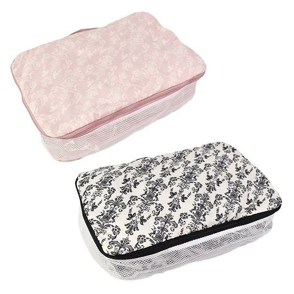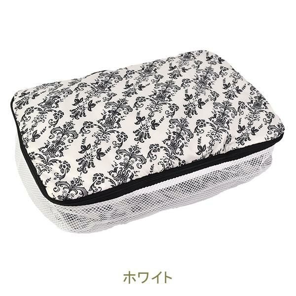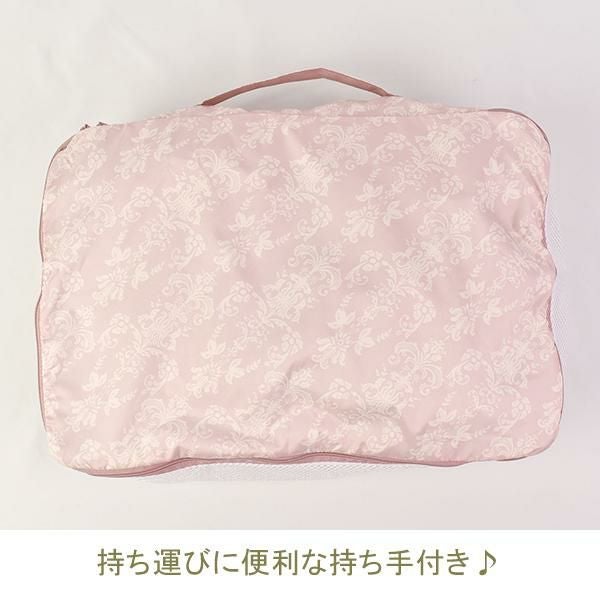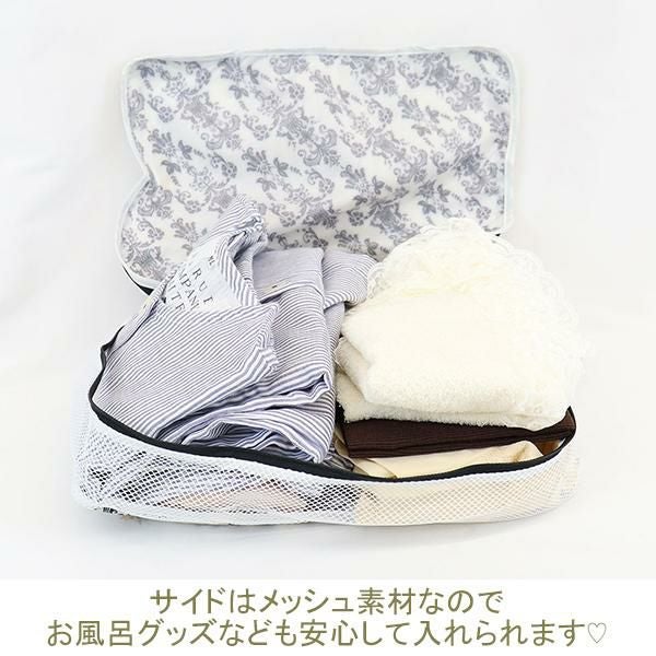 圧縮効果で、洋服や下着を整理しながら、見た目以上の収納力を発揮します。撥水生地とメッシュ素材で通気性も良く、使わない時はフリル付きポケットに収納可能!旅行時のランジェリーケースや化粧品入れとしてはもちろん、フィットネスやクローゼット整理にも♪