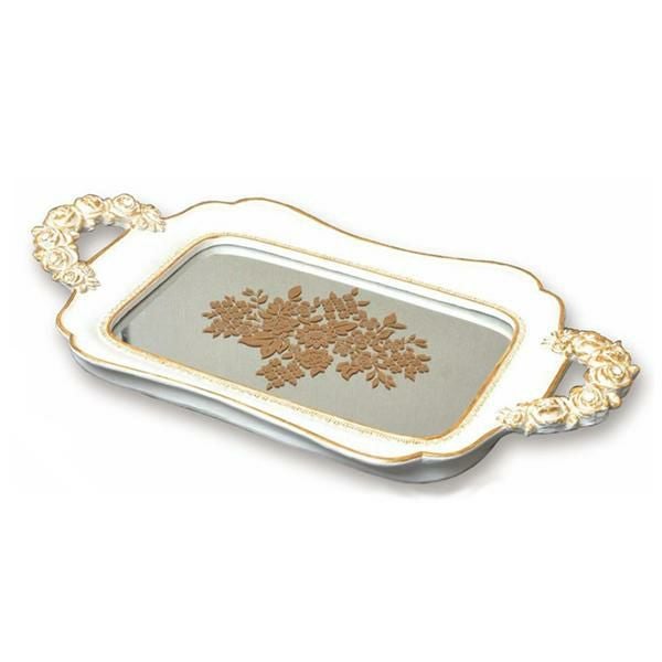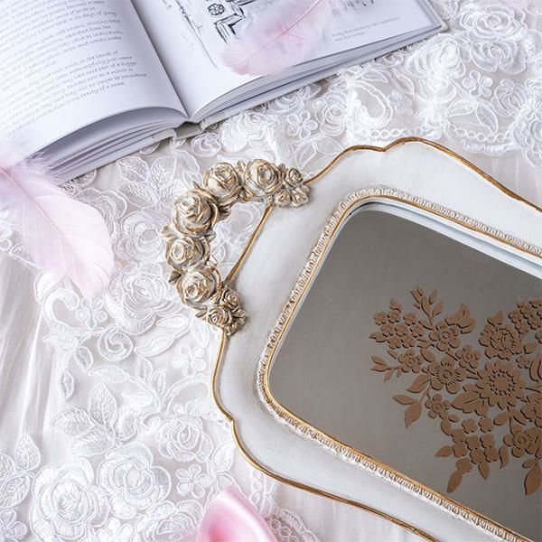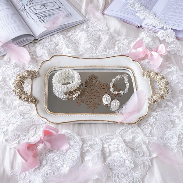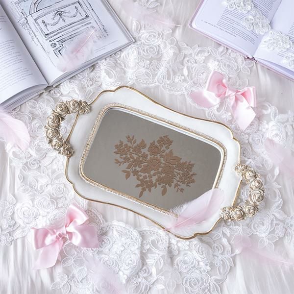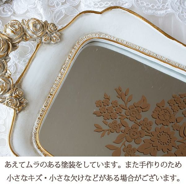 左右にあしらわれた繊細なバラの装飾が上品なアンティーク調のミラートレー。