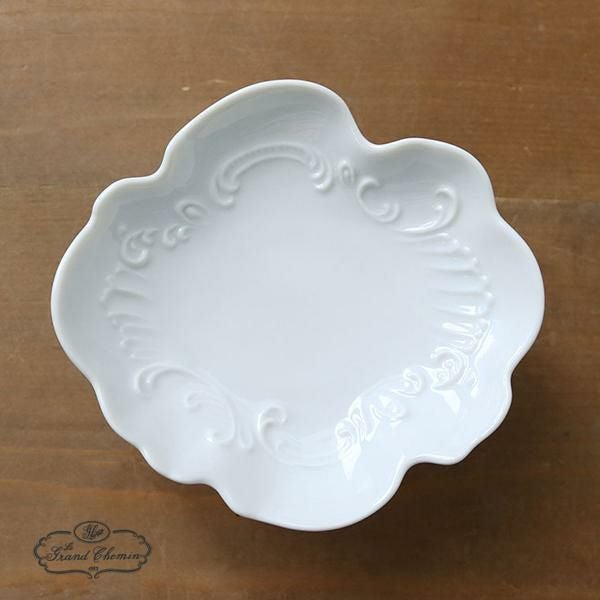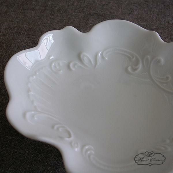 白い陶器に緩やかなレリーフ模様がレースのように象られていて美しい。