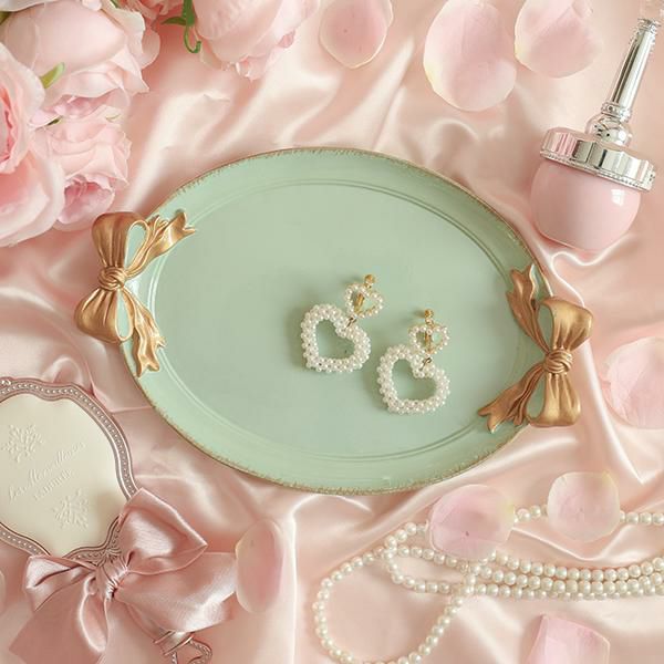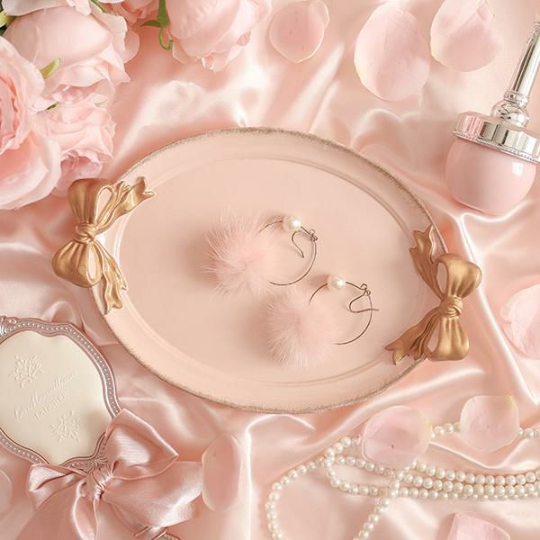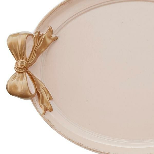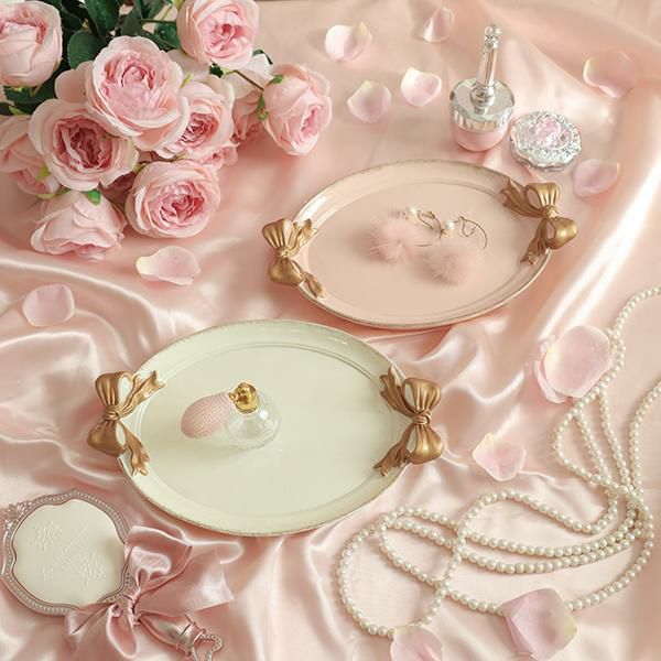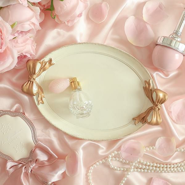 まるで結んだような立体的なリボンが可愛い、楕円形のトレー。ホワイト・ピンク・グリーンの上にあしらわれた左右2つのゴールドリボンがアクセントに♪玄関などで外出時持ち歩くアイテムのちょい置きに使用したり、お気に入りのアクセサリーや、コスメなどをディスプレイするのもオススメです。