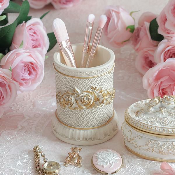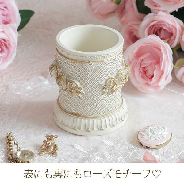 繊細なローズモチーフが美しい、上品なペン立てです。優しいホワイトアイボリーのベースに、高級感のあるゴールドを合わせました。細部にまでこだわったデザインが、アンティークな雰囲気。デスクで筆記用具を置くだけでなく、ドレッサーでメイクブラシ立てにするのもオススメです。