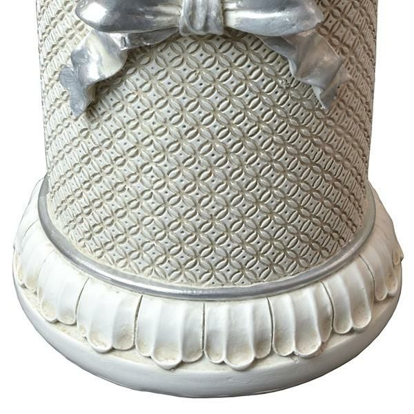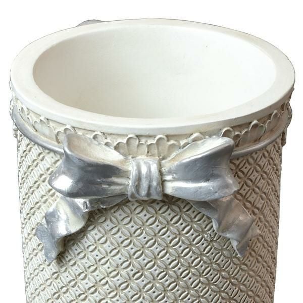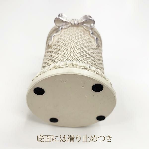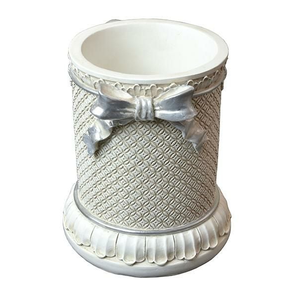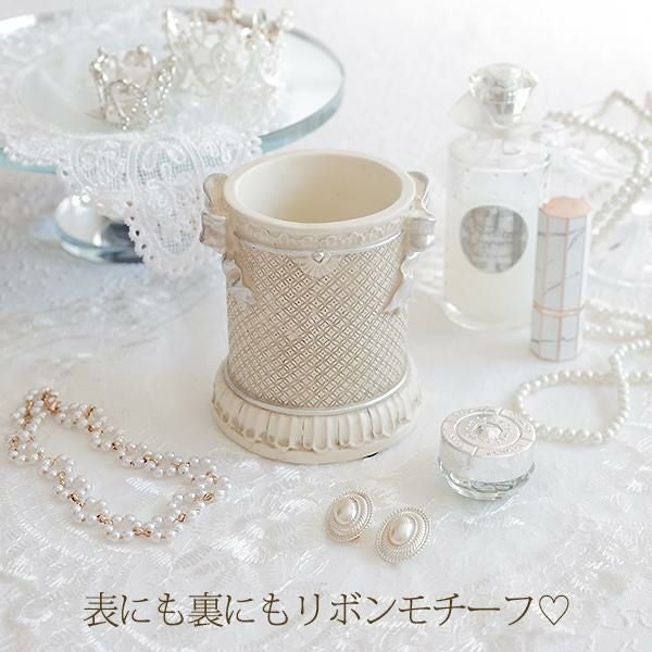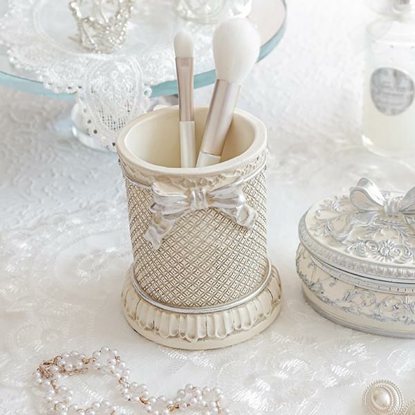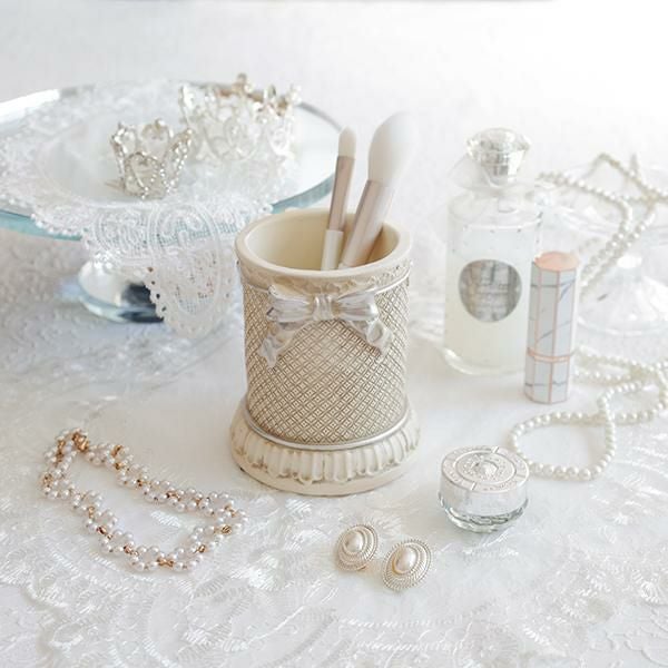 繊細なリボンモチーフがかわいい、上品なペン立てです。優しいホワイトアイボリーのベースに、高級感のあるシルバーを合わせました。細部にまでこだわったデザインが、アンティークな雰囲気。デスクで筆記用具を置くだけでなく、ドレッサーでメイクブラシ立てにするのもオススメです。