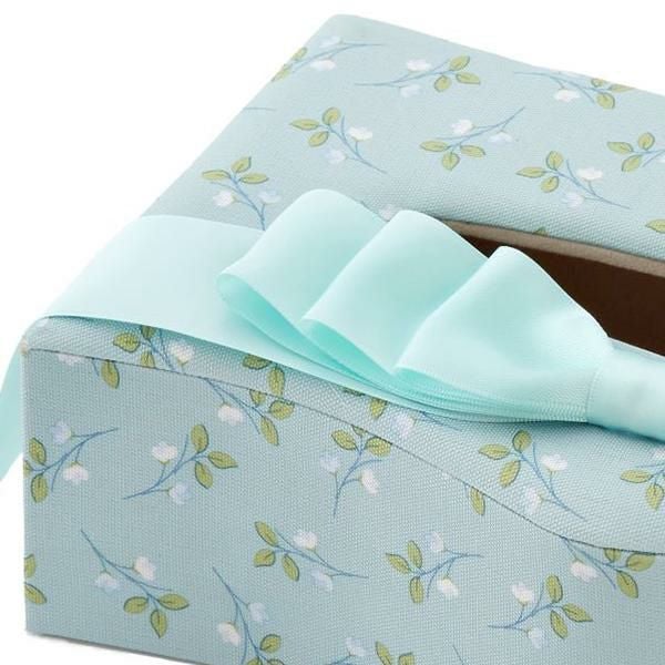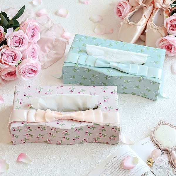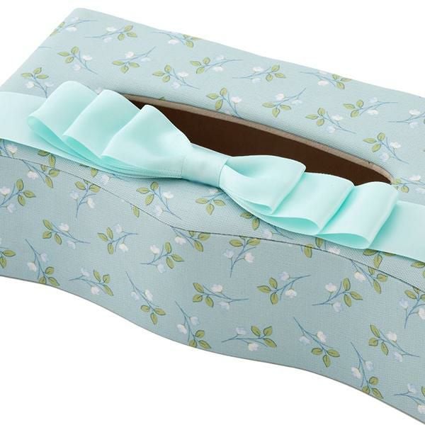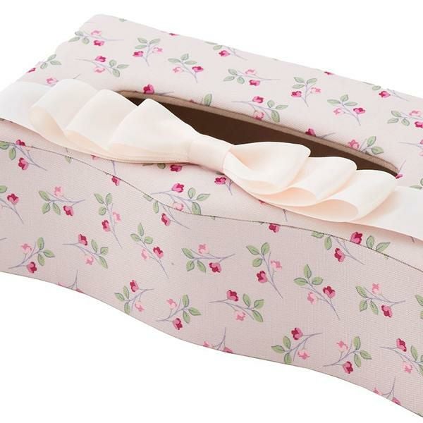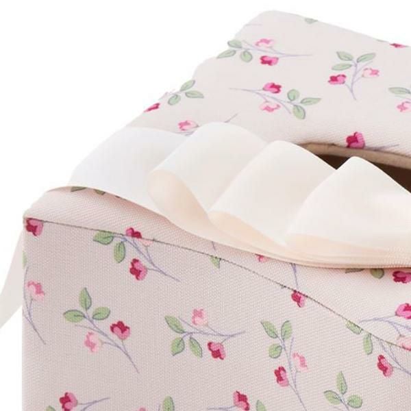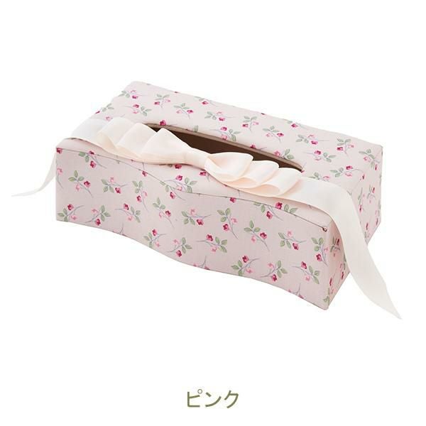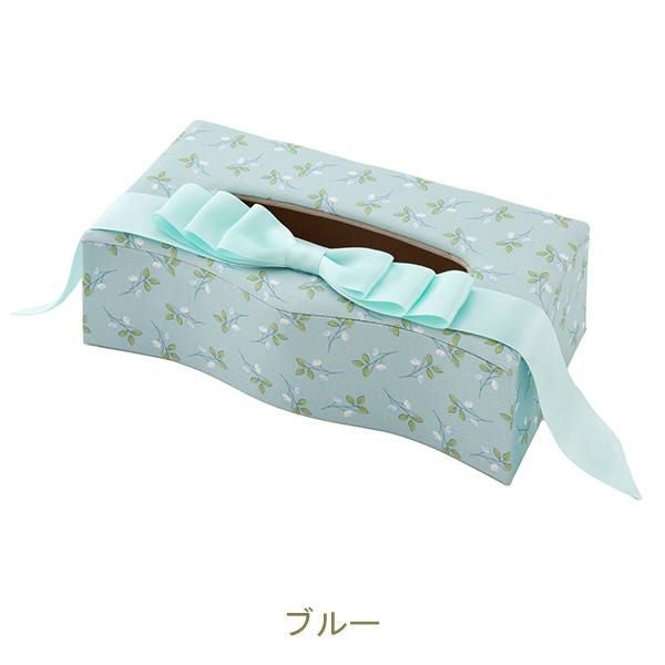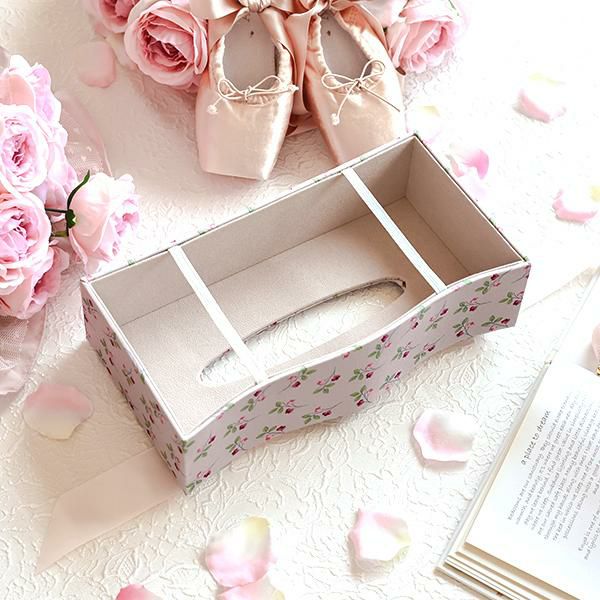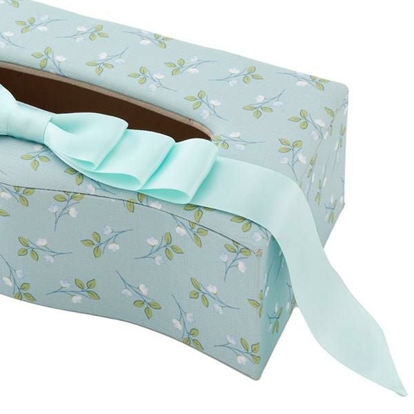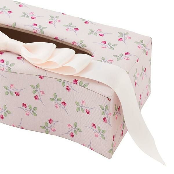 カルトナージュ風のデザインが上品なティッシュボックスケース。上部にあしらわれたエレガントなリボンが目を引きます。