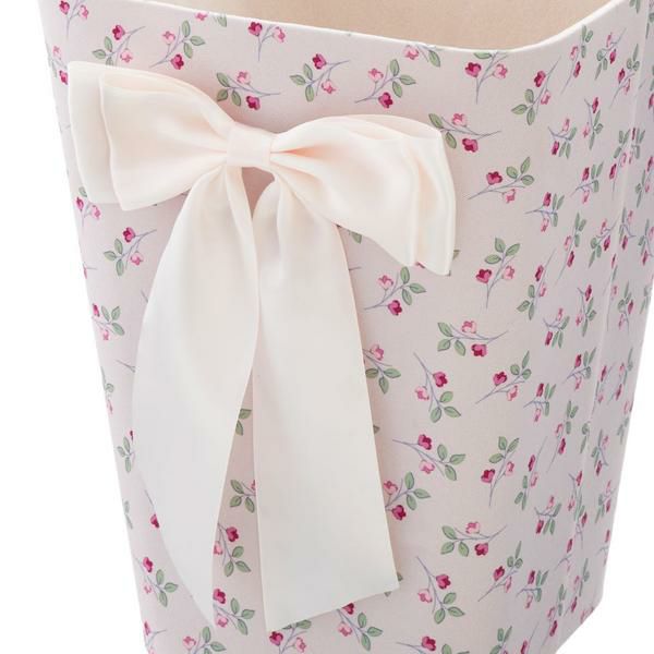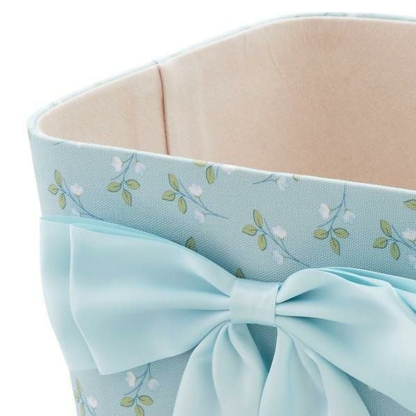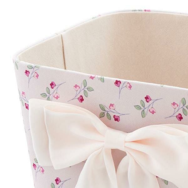 カルトナージュ風のデザインが上品な縦型のスクエアボックス。前面にあしらわれたダブルリボンが目を引きます。