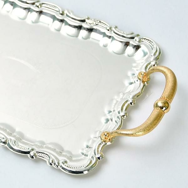 ティータイムに最適なトレーはちょっとしたおもてなしに重宝しそう♪トレー表面に繊細にデザインされたアラベスク柄がクラシックな雰囲気を作り出します。ティータイムのスイーツトレイとしてだけでなく、アクセサリーやお気に入りの小物置きとしてもオススメです。※本品は食器ではありません。食品を置く際は紙などを敷いてご使用ください。