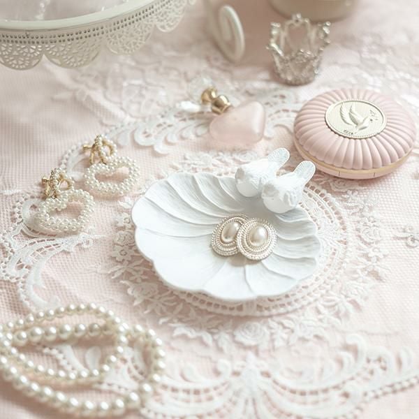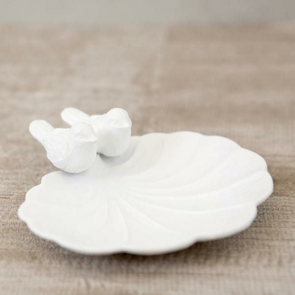 お皿の縁の小鳥が可愛いプレート。リングやネックレスなどの小さなアクセサリーを美しく飾ることができます。ドレッサーやチェスト上だけではなく、玄関で鍵の定位置にしても♪大切なものや、お気に入りのアイテムをおしゃれにディスプレイできます♪