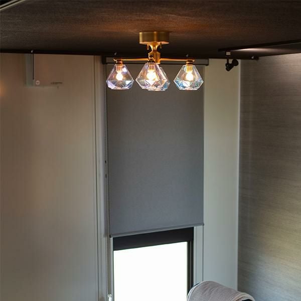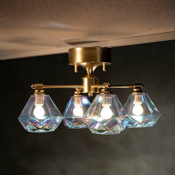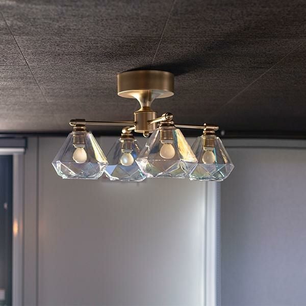 角度や光の加減によって、さまざまな表情を見せてくれるオーロラガラスのシェードが印象的な天井照明。まるで宝石のようにきらめくダイヤモンド型のフォルムが、お部屋にアクセントを添えてくれます。天井の低いお部屋やワンルームにも取り入れやすく、玄関・廊下・洗面所などのスペースもおしゃれに演出。光の重なりが生む幻想的なムードは、ちょっと大人っぽい空間にも合わせやすいシンプルだけどおしゃれなデザインライトです。