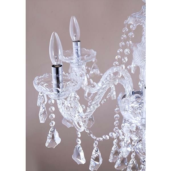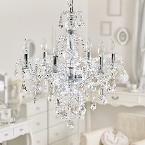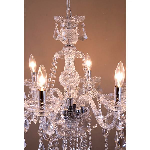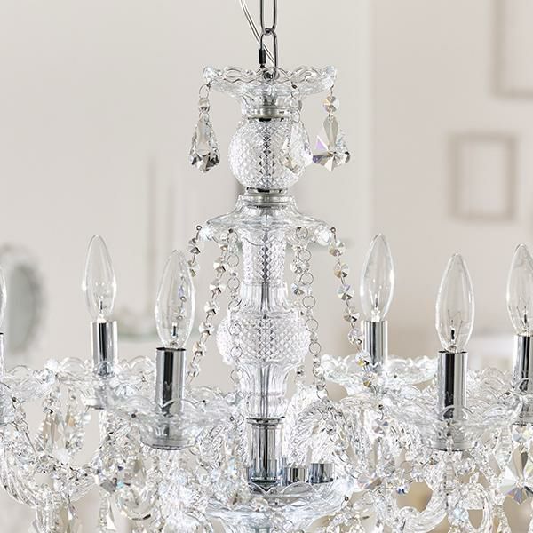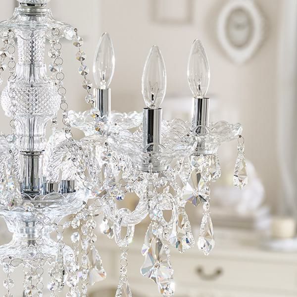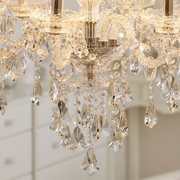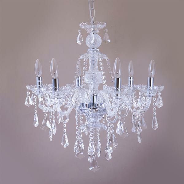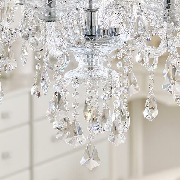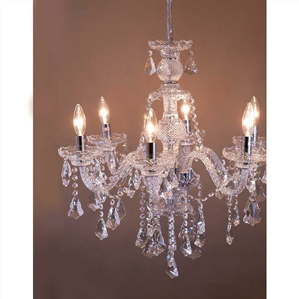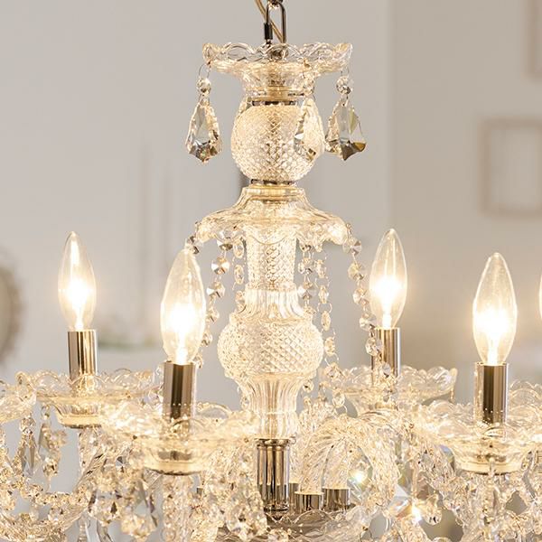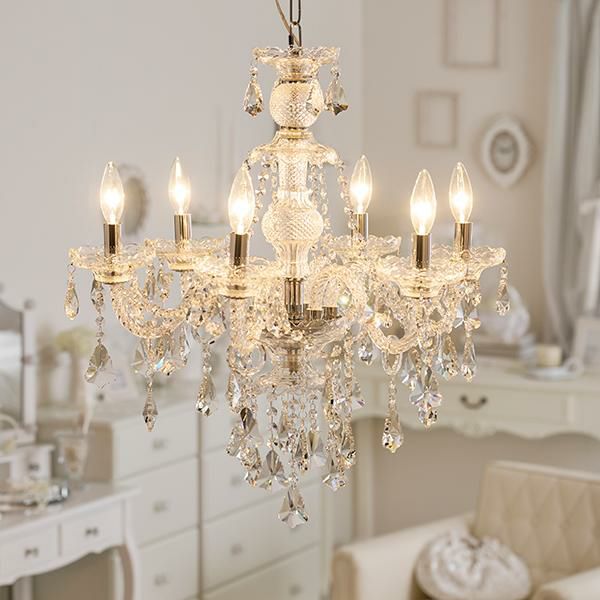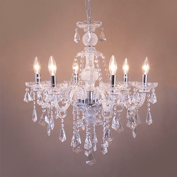 クリスタルガラスの輝きが美しい6灯シャンデリア。パーツは全てクリスタルガラスなので、光の反射がとても美しくラグジュアリーなムード。開閉式チェーンなので、チェーンの長さは自由に変更ができます。