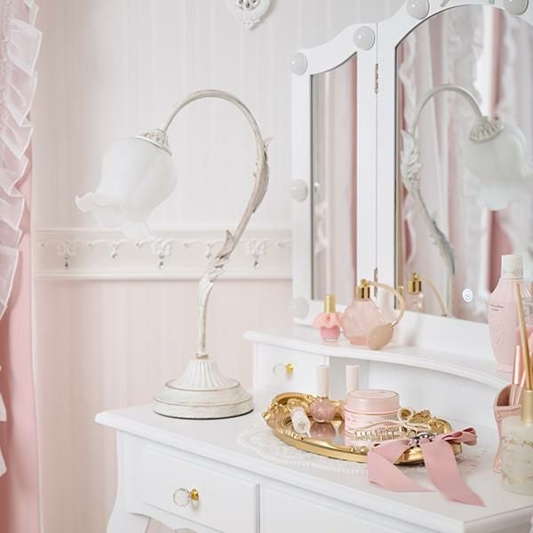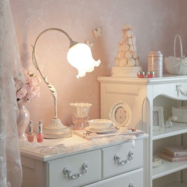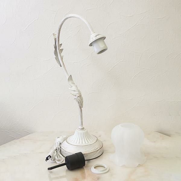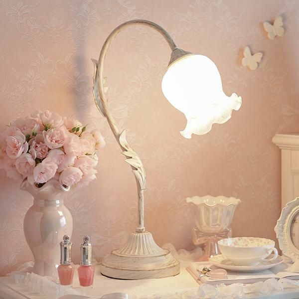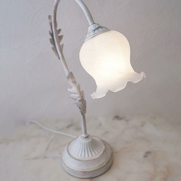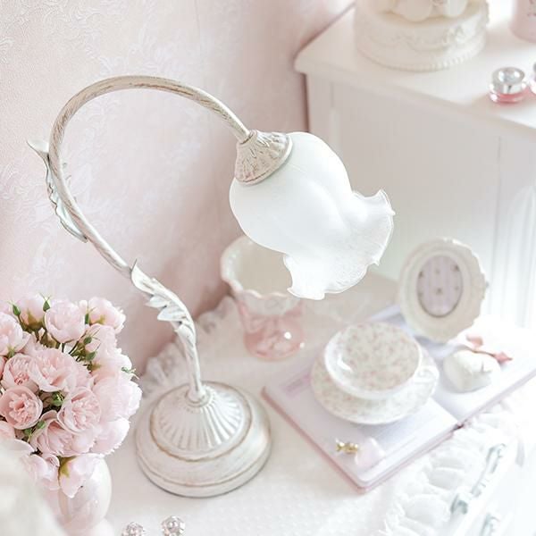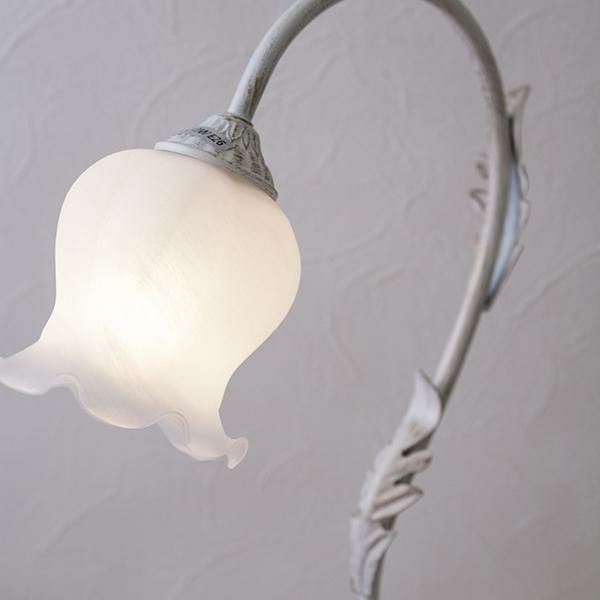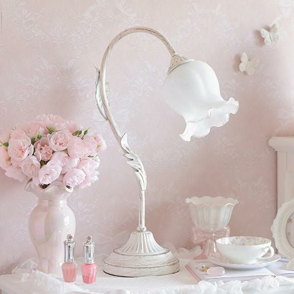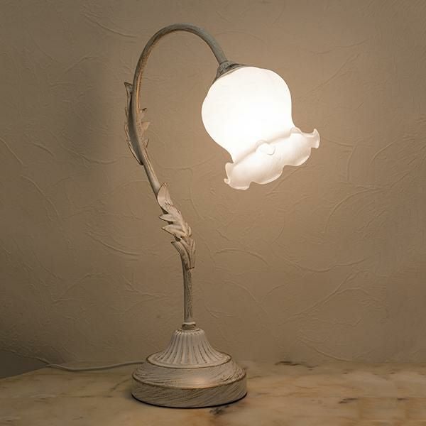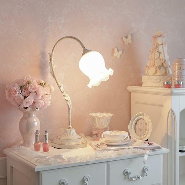 上品な美しさのあるテーブルランプはお花をイメージしたデザイン。スタンド部分には柄に沿うようにエレガントな葉っぱをあしらい、お花をモチーフにしたガラスシェードは先端のフリルがリュクスなムードです。