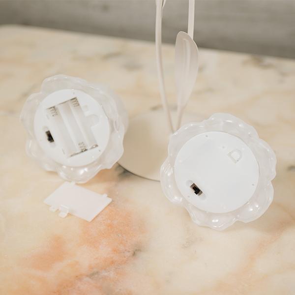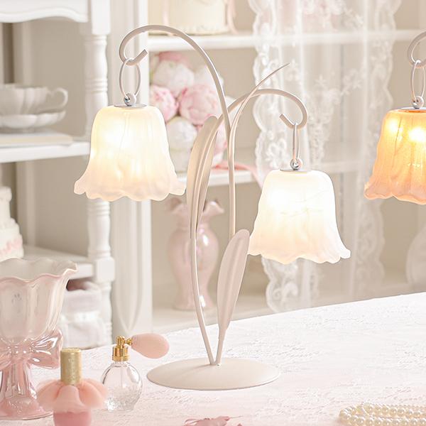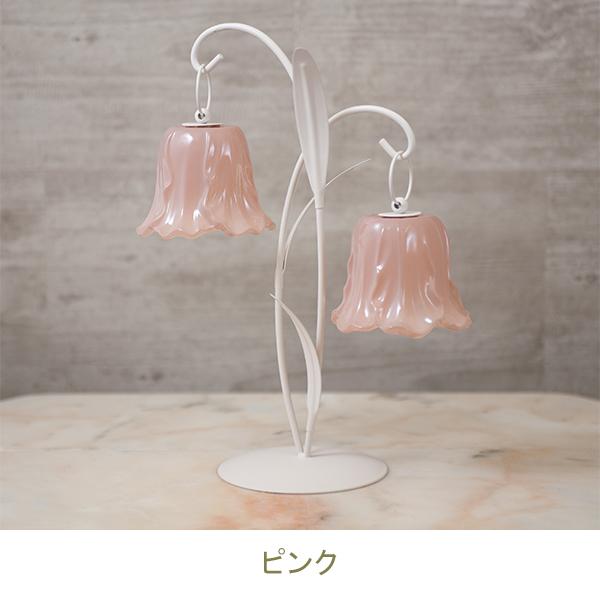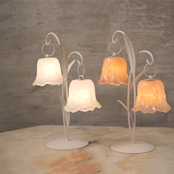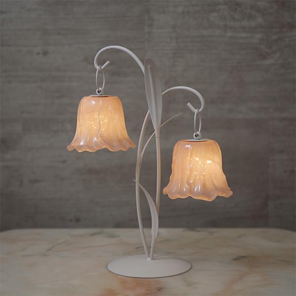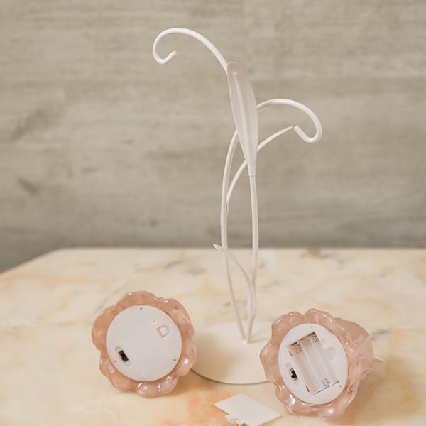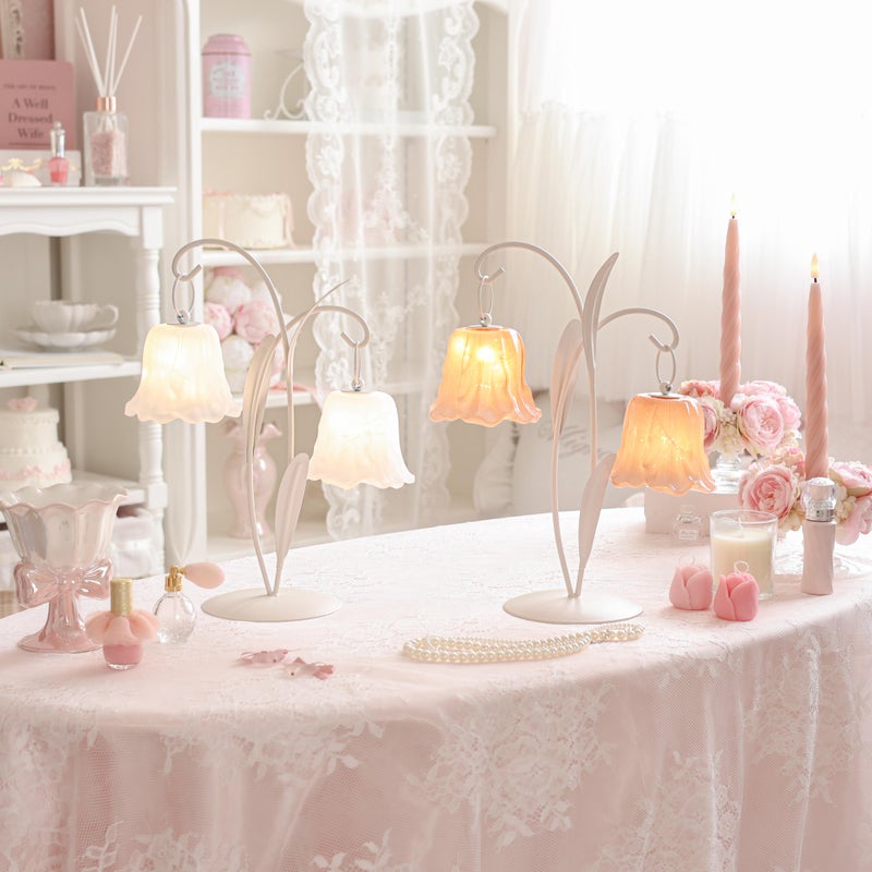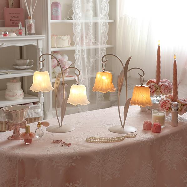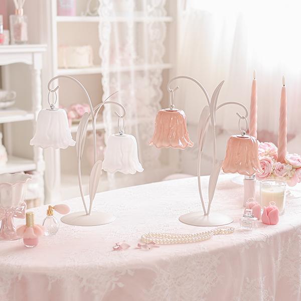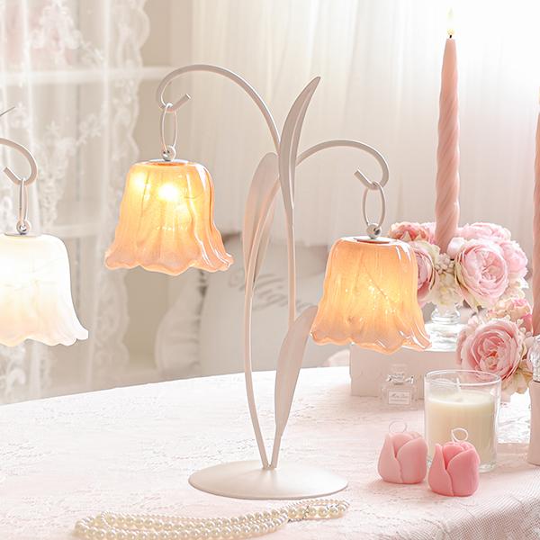 可憐に咲くチューリップをイメージした、繊細なガラスシェードの2灯LEDランプ。 アンバーカラーのガラスにアンティーク風のシルバーペイントを施しました。 スイッチを入れると、透け感のある花びらから柔らかな光が溢れ出し、お部屋を優しく幻想的な光で照らします。コードレスな電池式なので、お気に入りのドレッサーやベッドサイドなど、場所を選ばずどこでも「可愛い」を演出。清楚なホワイトと、甘いピンクの2色から、あなたのお部屋にぴったりの一輪をお選びください。