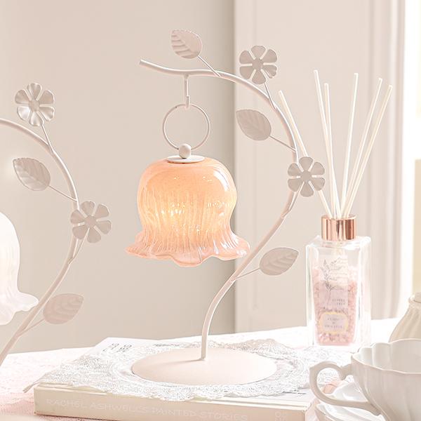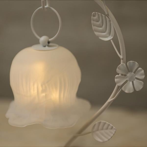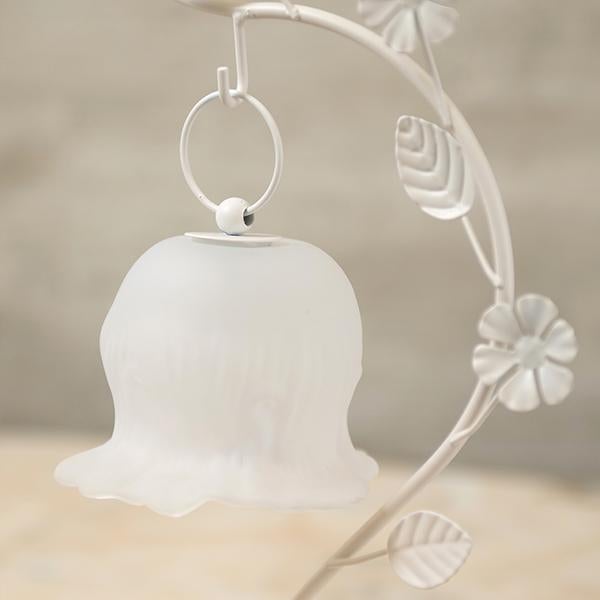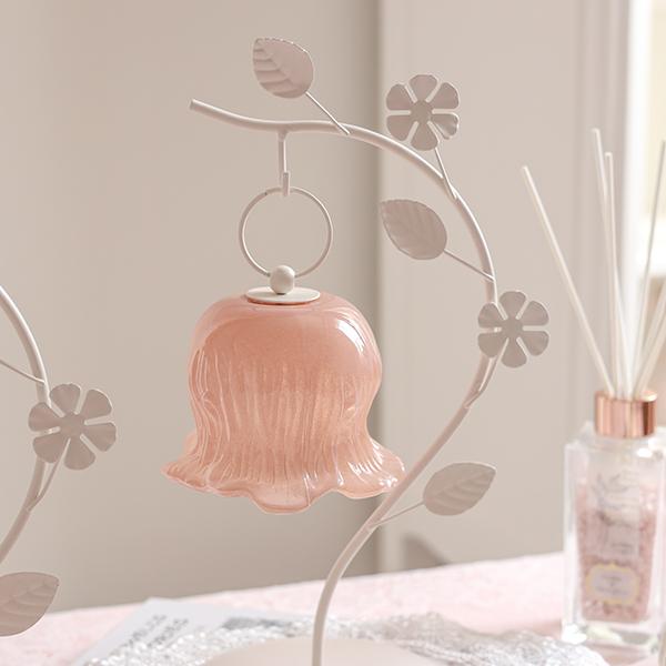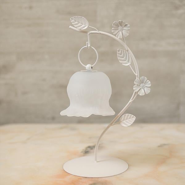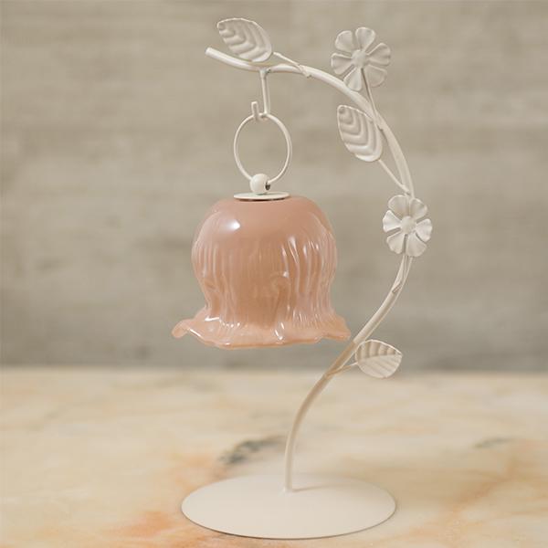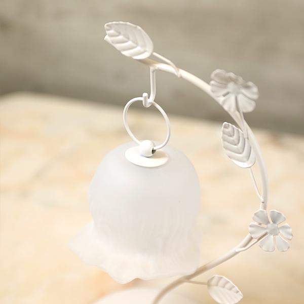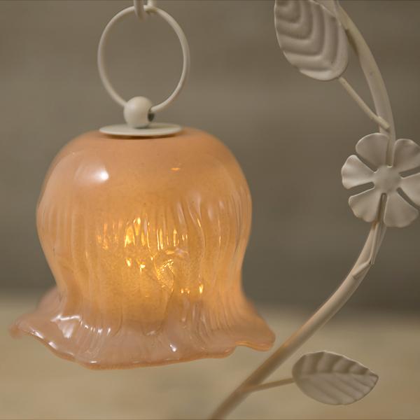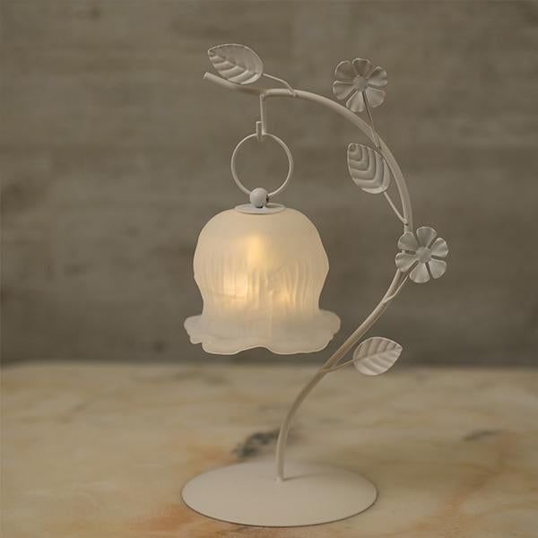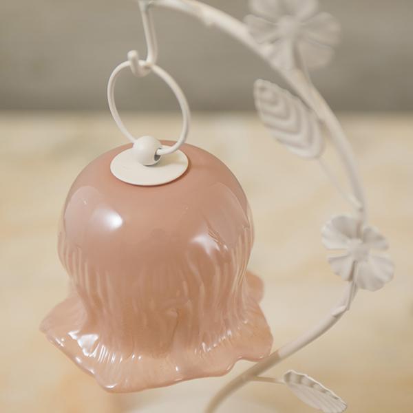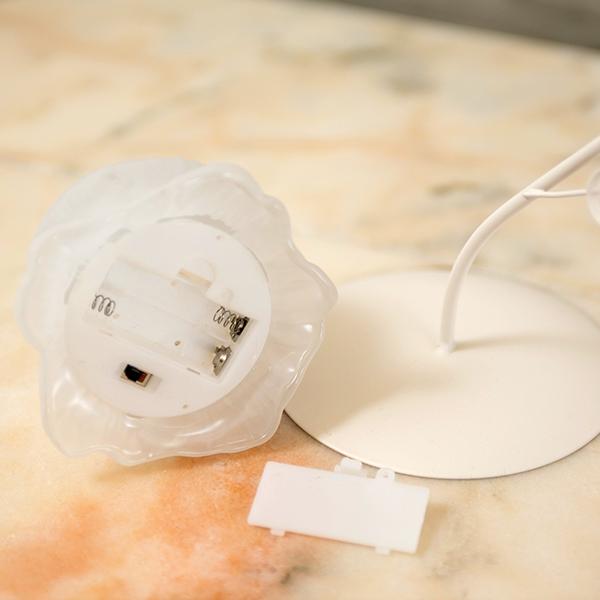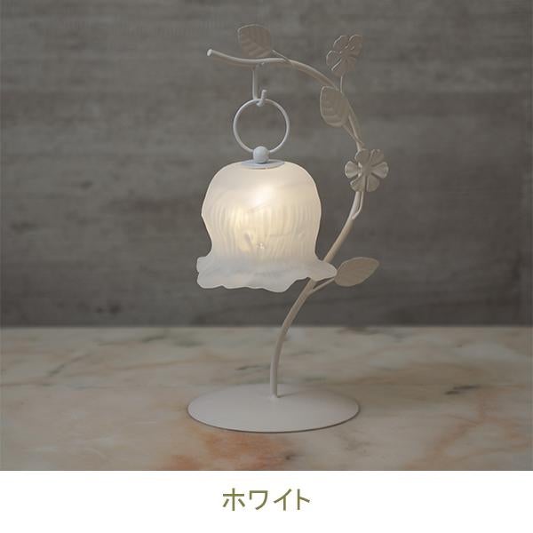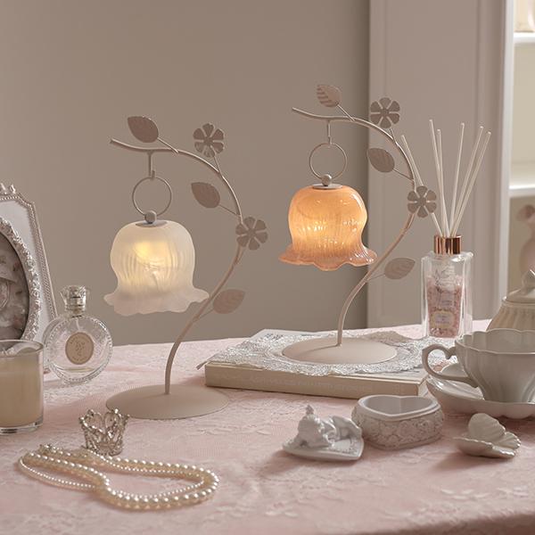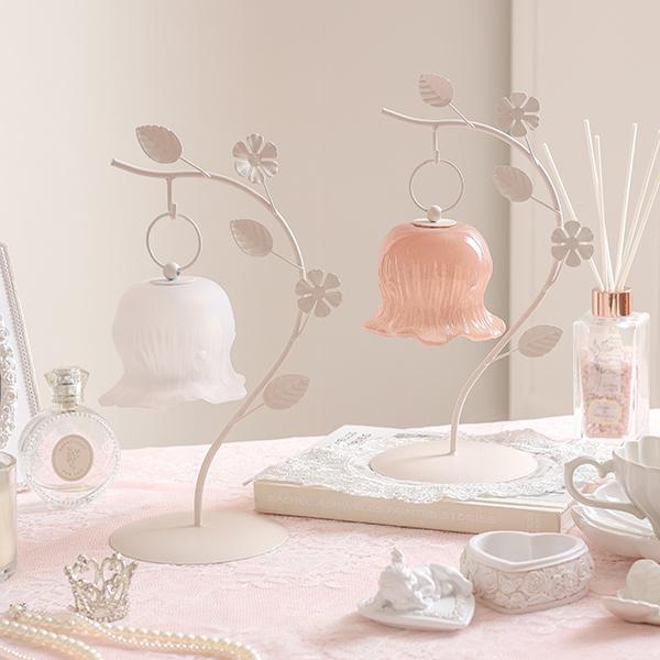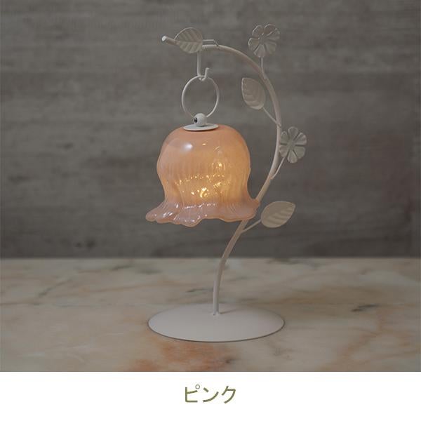 しなやかな曲線を描く葉っぱのスタンドから、ふっくらとしたお花のシェードがちょこんとぶら下がる愛らしいデザイン。繊細なガラスシェードのLEDランプは、アンバーカラーのガラスにアンティーク風のシルバーペイントを施しました。 まるで摘みたての一輪の花がお部屋でそっと揺れているような、繊細でやさしい佇まいに心がときめきます。コードレスな電池式なので、お気に入りのドレッサーやベッドサイドなど、場所を選ばずどこでも「可愛い」を演出。清楚なホワイトと、甘いピンクの2色から、あなたのお部屋にぴったりの一輪をお選びください。