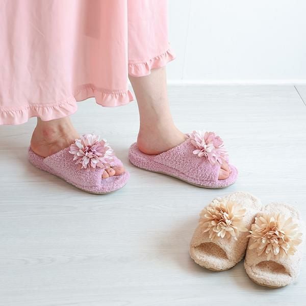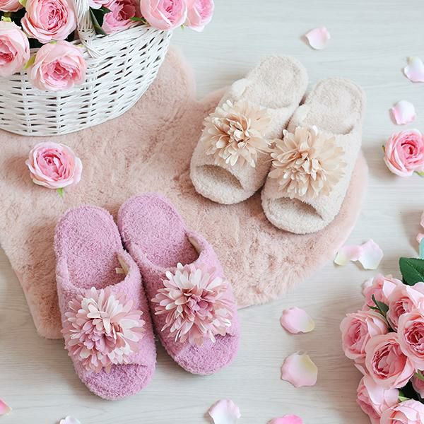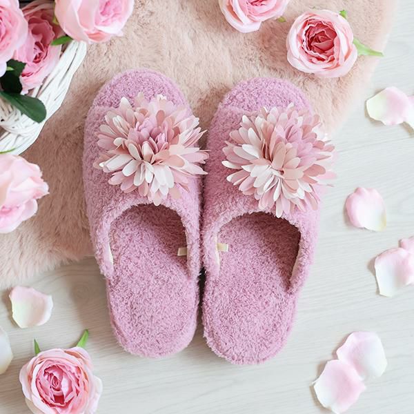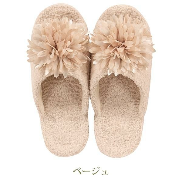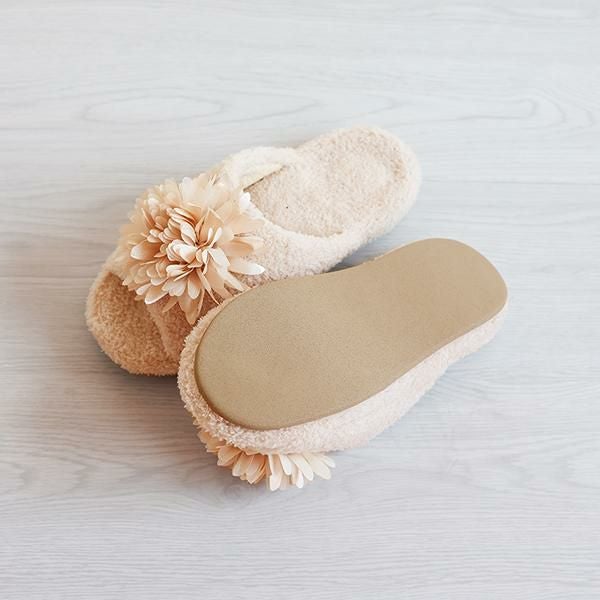 やわらかなパイル生地を使い、素足で履いても心地いい足触りのスリッパ。目を惹く花モチーフはやわらかいポリエステル生地使用で、ふんわり揺れるシフォンとサテンの異素材感が大人かわいい印象に。程良い踏み心地のツボ押し中板を使用しているので、おうち時間やお仕事中にもこっそりリフレッシュできちゃいます。