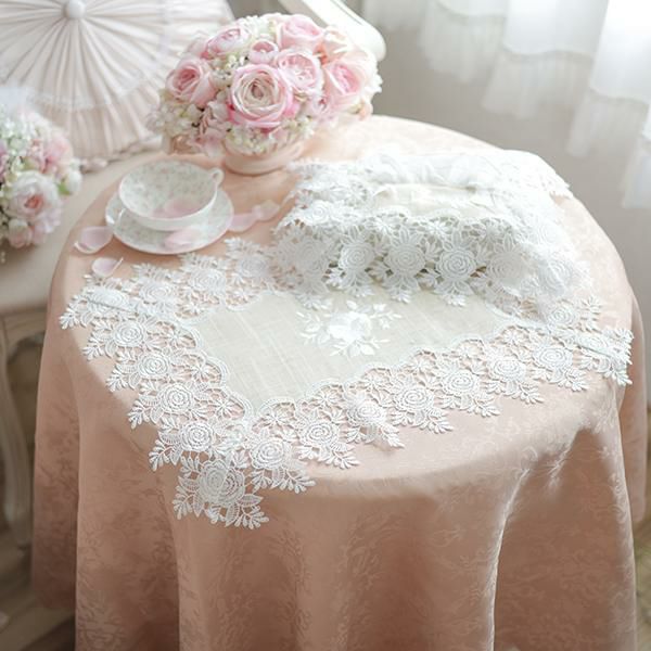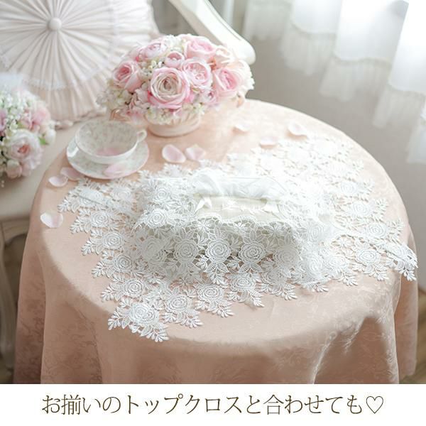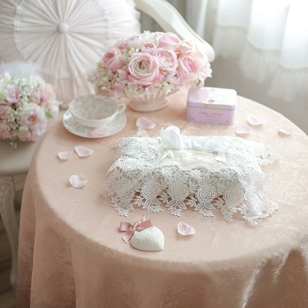 ローズなど花をモチーフとした大きなレースが存在感たっぷり。取り出し口のサイドにはミニリボンを付けて細部ににまでこだわりました。