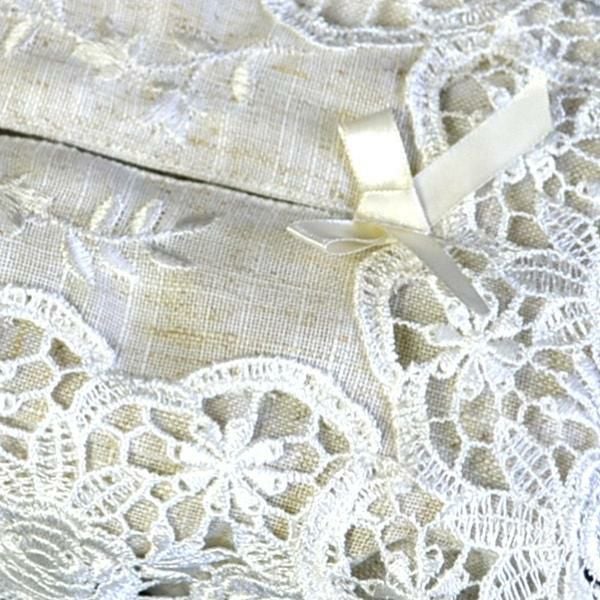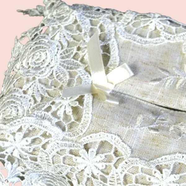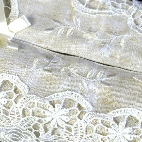 リネン調の生地に大胆にケミカルレースを重ねた、エレガントでシックなデザインのティッシュケースカバー。
