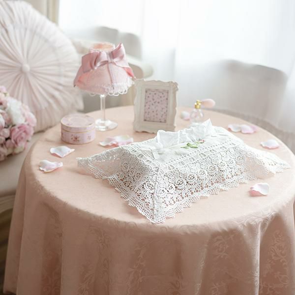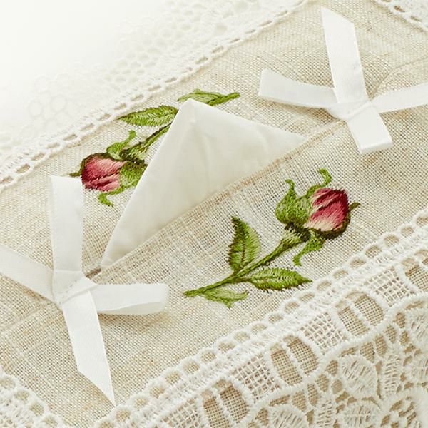 花をモチーフとした大きなレースが存在感たっぷり。取り出し口の上下には繊細な蕾のローズをあしらい、サイドにはサテンのミニリボンを付けて細部ににまでこだわりました。