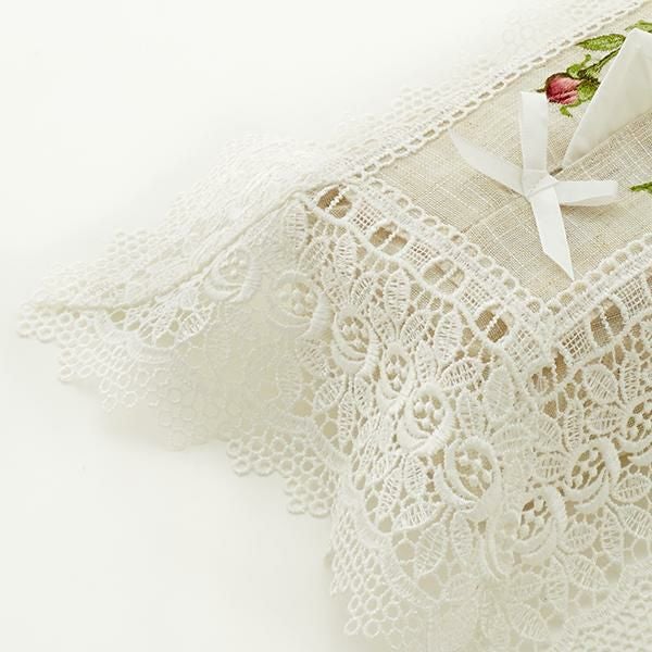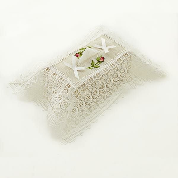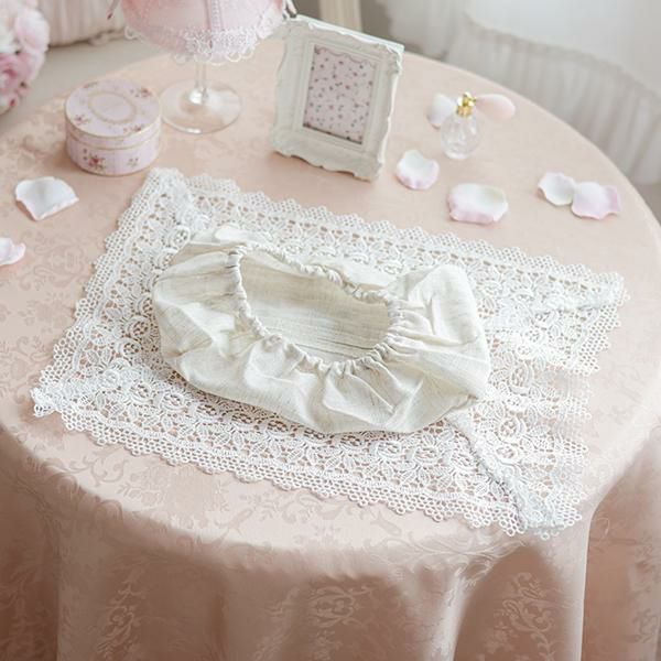 リネン調の生地に大胆にケミカルレースを重ねた、エレガントなデザインのティッシュケースカバー。