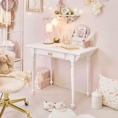 組み立てが簡単ですぐに出来ました!引き出し横のふわふわした曲線のカットが可愛い〜!ゴールドのリボンも机に合っていて可愛いです!