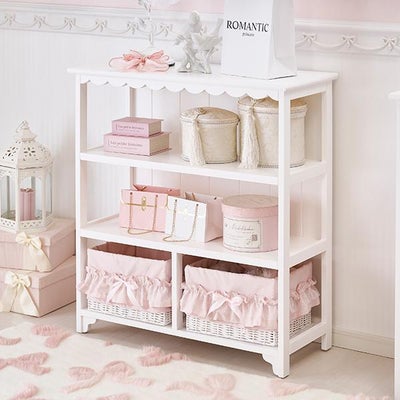 ぬいぐるみや子供のおもちゃを飾っています。 少し小さめですが、白くて他にはないスカラップやハートの脚のデザインがとてもかわいらしくて気に入っています。 下の段のかごを子供がよくひっくり返していますが、作りが思ったよりしっかりしていて、汚れや傷が気になったことは現状ありません。