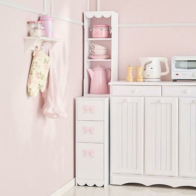引き出しのリボンに惹かれて購入しましたが、冷蔵庫とキッチンの間のスペースにジャストフィットでお箸やスプーン、コップ、調味料などを収納するのに使ってます。軽い上に組み立ても簡単ですが、普段動かさないところに設置してしまったのでお掃除をこまめにしないとすぐ埃が溜まってしまいそうです…。見た目はすっごく可愛いので文句なしです(੭ ɞ̴̶̷ ܁̫ ɞ̴̶̷ )੭♡
