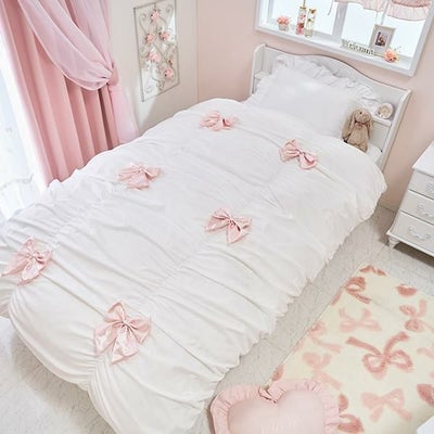 収納付きすのこベッドと一緒に購入しました! パッケージを開けた瞬間にやにやしちゃうくらい可愛いです🎀🤍 枕カバーもベッドシーツも、お布団カバーもどれもつけやすかったです🙌🏻 私が使っているお布団はこちらのカバーより一回りくらい小さいので、だいぶ布が余ってしまうのですが見た目がきたないなど特に気になることはないです♡ 使用しているお布団の色がクリーム色っぽい色にピンクのローズの柄なのですがその柄がカバーの下にうっすら透けますがそれもかわいいです🩰 ただ、青や緑色のお布団だと透けるのが気になるかもしれないです! 枕カバーはフリルが可愛くて、ホテルのベッドみたいな枕になります🫶🏻️ シーツも手触りがよくてずっとベッドにいたくなります♡ リボンの色味は写真とほぼ同じです! 最初はお布団カバーを見たとき、リボンを留めるためのボタンがどこについてるのか思っていたより小さくてわかりづらいかもなので、端からよく見ていくと見つかります!笑
