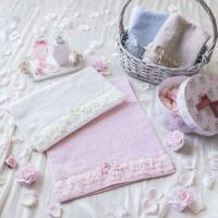 わりと大きめなタオルでフェイスタオルとしては十分です。 レースとリボンがポイントでおしゃれです。 -