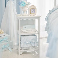 イメージしてたよりはコンパクトなサイドテーブルだけどサイズ表通り!フリル布が最高にかわいい🩵 他の家具も同系統で揃えたので、部屋のイメージにもぴったり合ってます🫶🏻